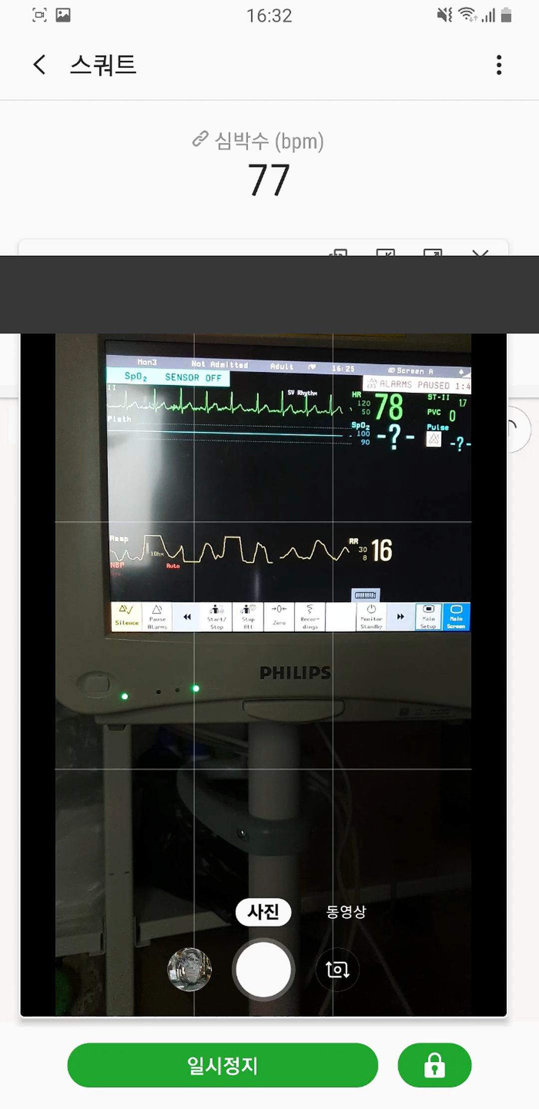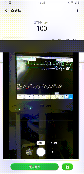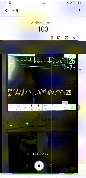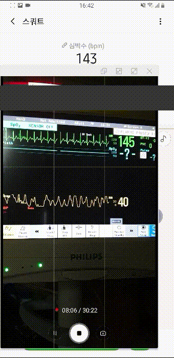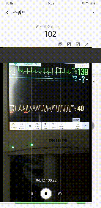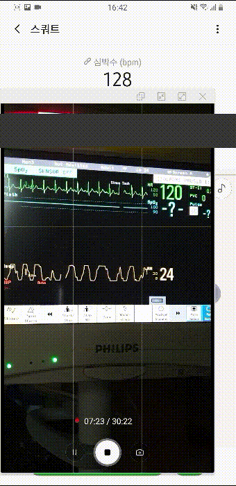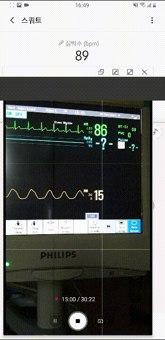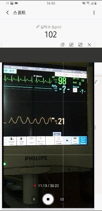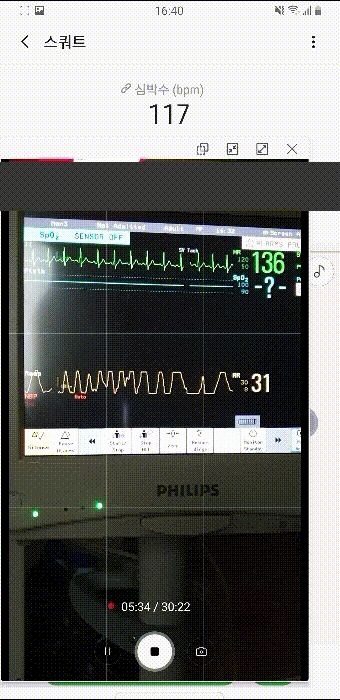 심박수라 써져 있는 것은 앱을 통해 동기화시킨 갤럭시 핏의 측정값이고, 아래 작은 창으로 띄운 것은 카메라로 모니터를 찍은 것이다. 그 아래 녹색으로 써져있는 숫자가 모니터(환자감시기, Vital sign patient monitor)로 측정한 심박수다. 그 아래에 있는 숫자는(RR:Resp. Rate) 1분간 호흡 수다.