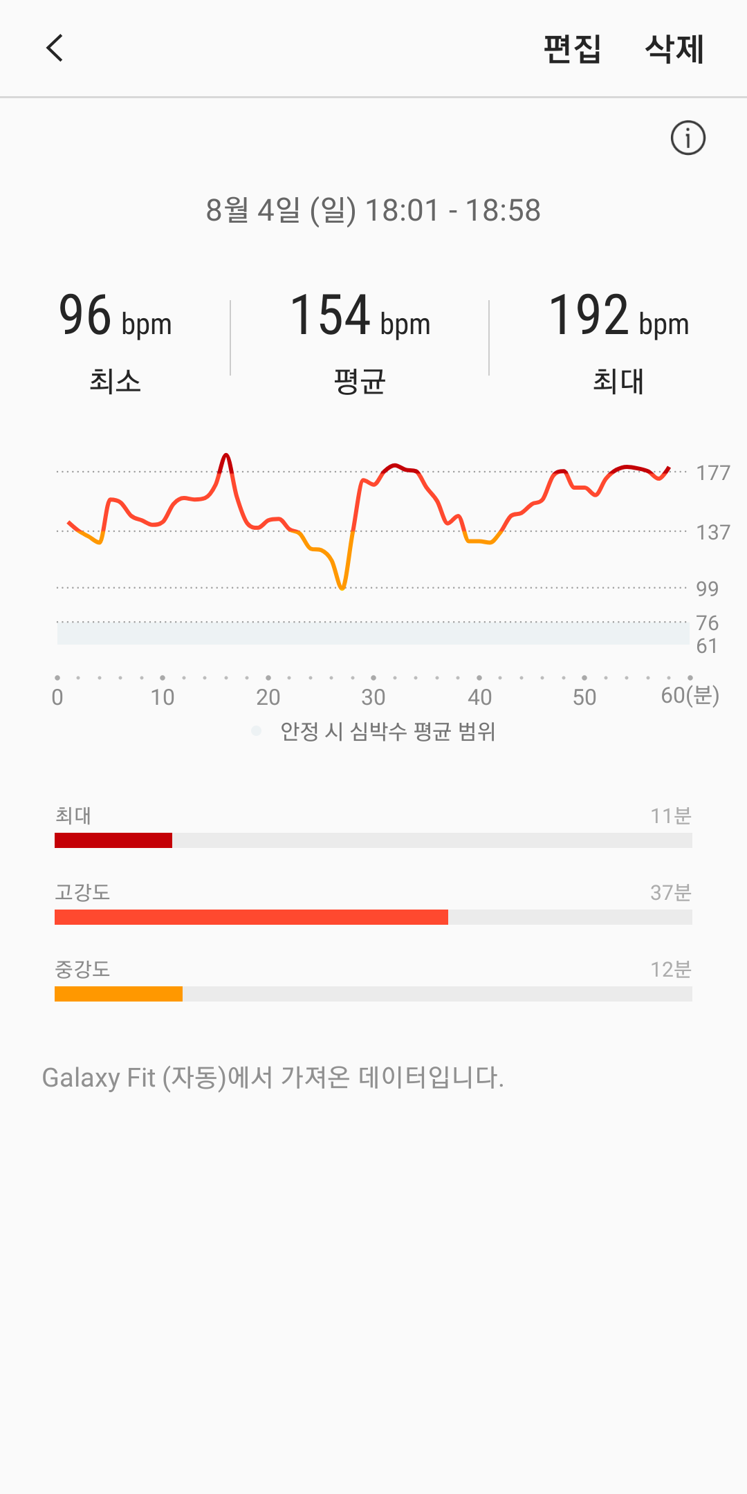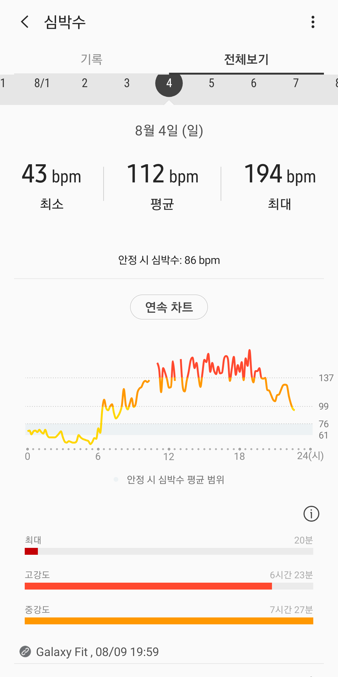 갤럭시 핏은 전체적으로 만족할 수 있는 밴드다. 8월의 불볕 밑에서도 밝기 8이면 충분한 디스플레이와 방수 락 기능, 알림-답장 기능, 폰 찾기 기능 등등... 다만 아쉬운 것이랄지 내가 모르는 것인지 타이머 기능은 빠르게 분단위로 설정을 못하는 것이 아쉽다. 알람 기능도 워치 앱에서 따로 설정하는 것이 아닌 갤럭시 내장 '시계' 앱에서 구동할 수 있으면 좋겠다는 생각이 든다. 아무튼 이번 측정을 통해 심박수 측정이 제법 쓸만하단 것을 알았다. 그것으로 만족한다.