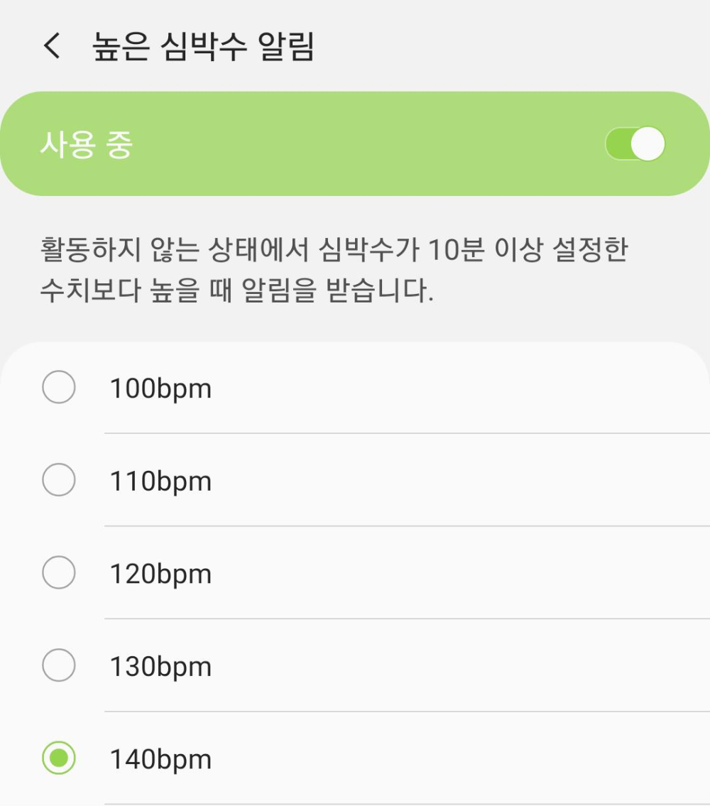그러나 측정을 할 때, 과열이 되서인지 측정을 못하는 것인지 심박수가 한 숫자로 고정되어 나타나는 케이스가 등산을 할 때 왕왕 보인다. 그럴 때는 재부팅을 하면 해결되긴 했다. 두 번째 스쿼트 때, 측정이 정확하지 않았던 이유는 잘 모르겠지만, 심박수가 높을 때엔 제법 비슷하다는 것은 이번 측정을 통해 알 수 있다. 결국 참고만 하라는 기능이지만, 정확하면 할수록 좋다. 내가 무리를 하고 있는지 모르기도 하고. 그러나 <높은 심박수 알림> 기능(아래)은 실제로 작동할지는 미지수다. 트렌드에 의해 보정되는 느낌이 있으니. 결국 이번 측정을 통해선 갤럭시 핏이 약간 높게 측정한다는 것과, 트렌드에 의해 보정하는 경향이 존재하며, (어디까지나 참고이지만) 꽤나 믿을 만 하다는 결과를 얻었다.